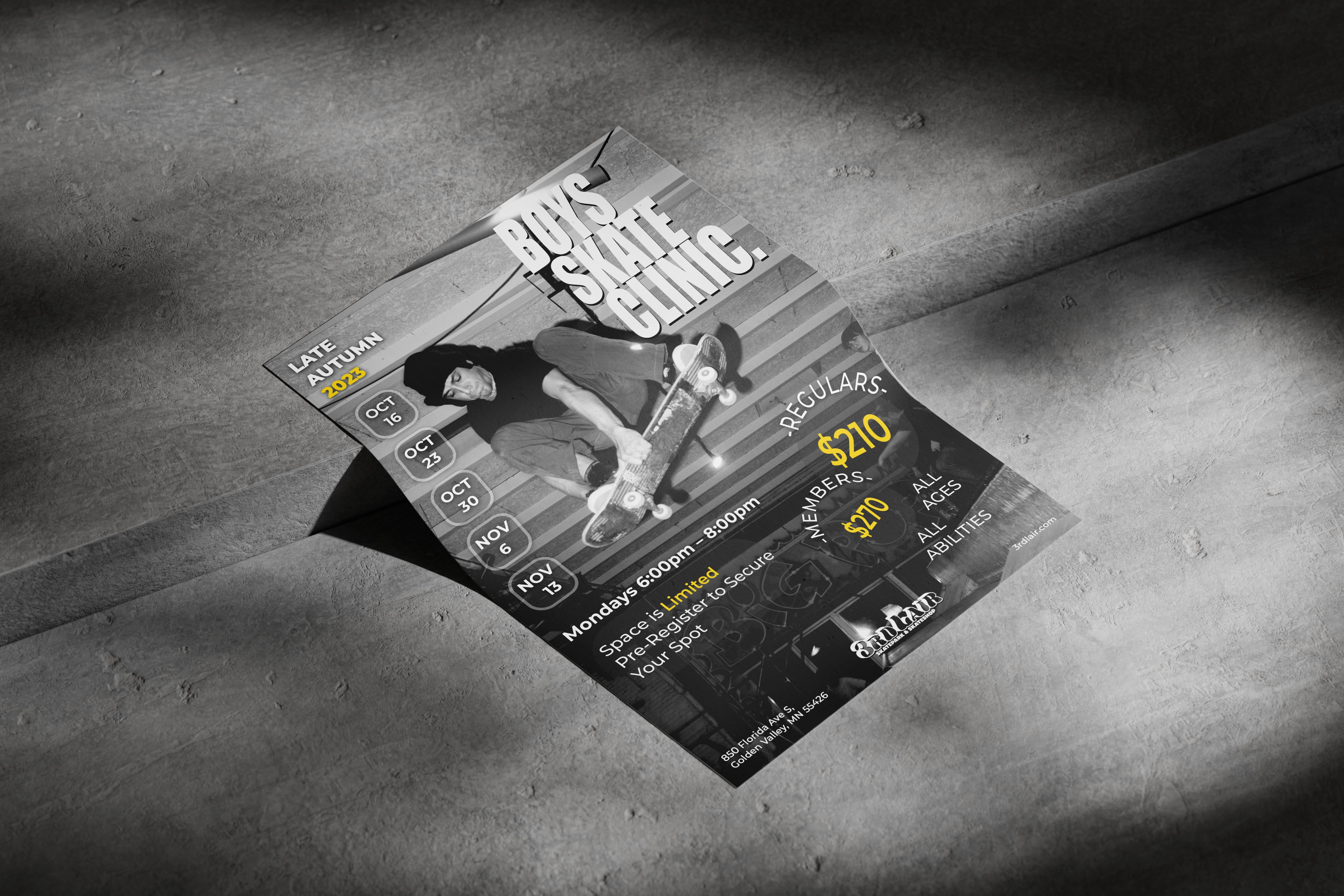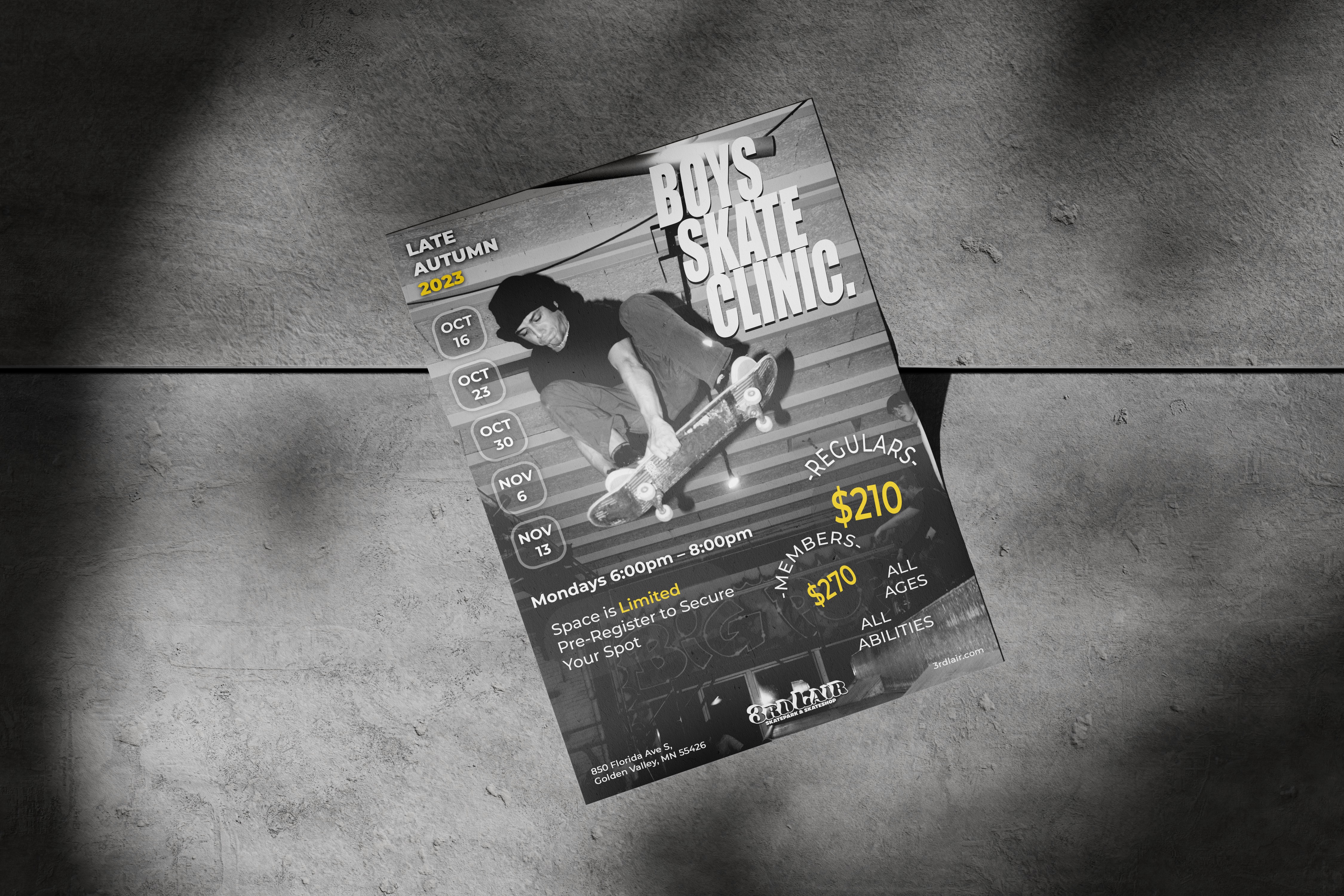 This project is an A4 poster for 3rd Lair’s Skate Clinic, designed from a provided logo and set of event details. The brief focused on using C.A.R.P. principles to organise the information, establish a clear hierarchy and create an energetic layout for a skate audience.